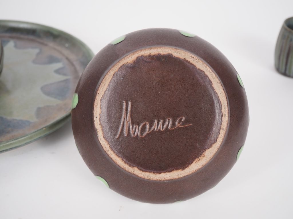 Plateau et 5 récipients en grès vert et brun , une bonbonnière en grès signée Maure.