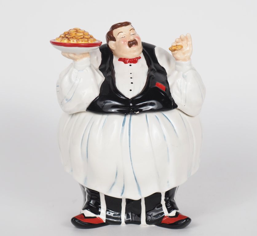 Pot couvert en céramique polychrome en forme de serveur jovial. H. 22,5 cm (fel, micro égrenures)