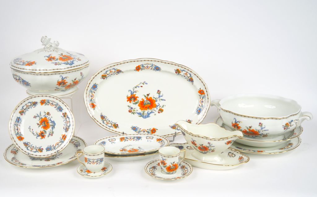 RAYNAUD. Partie de service de table en porcelaine de Limoges, décor "Vieux Chine" : une soupière, un légumier, 3 plats, 12 tasses et sous tasses, une saucière, 2 raviers, 24 grandes assiettes, 12 assiettes à soupe, 12 assiettes à fromage, 12 assiettes à dessert.