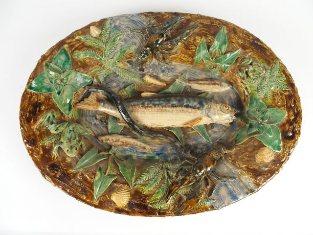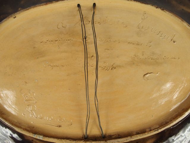 RENOLEAU. Grand plat ovale en barbotine à décor polychrome et en relief de poissons, de crustacés et de végétaux. Signé, dédicacé au dos (très petits manques). 37,5 x 51,5 cm
