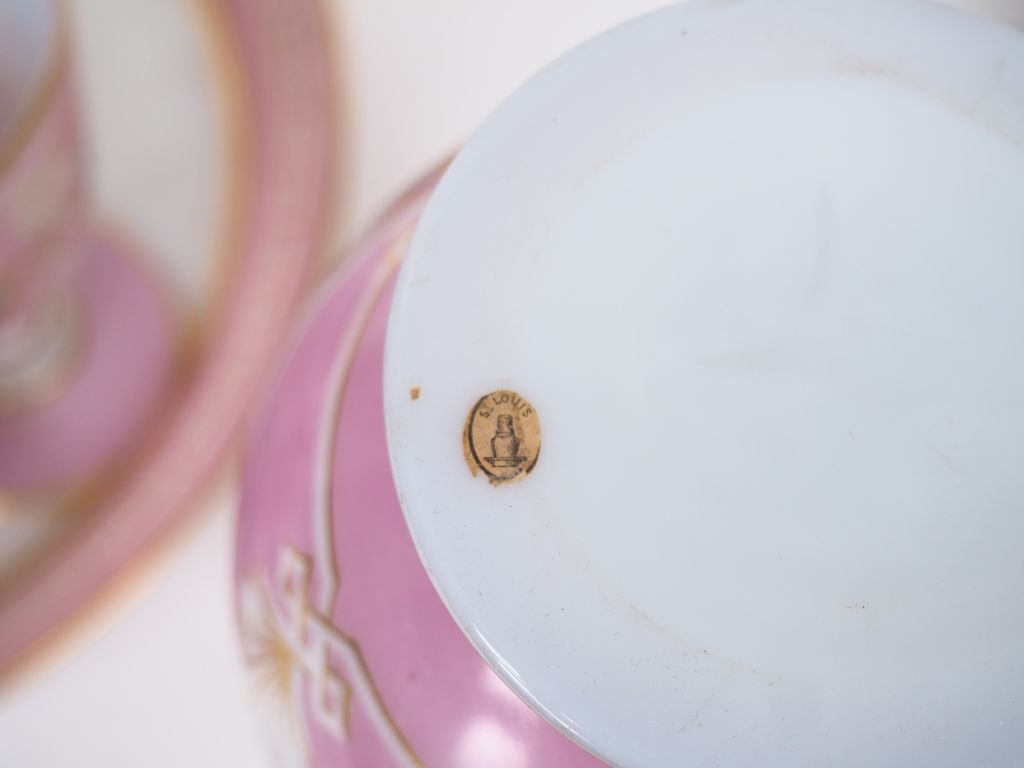 SAINT-LOUIS. (?) Service de nuit Napoléon III en opaline à décor de bouquets de fleurs dans des réserves, de liserés dorés et blanc sur fond rose. Porte une pastille "Saint-Louis" ancienne sur le flacon. Comprenant : - 1 grand flacon - 1 petit flacon - 2 verres à pieds - 1 sucrier