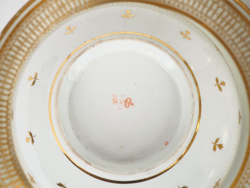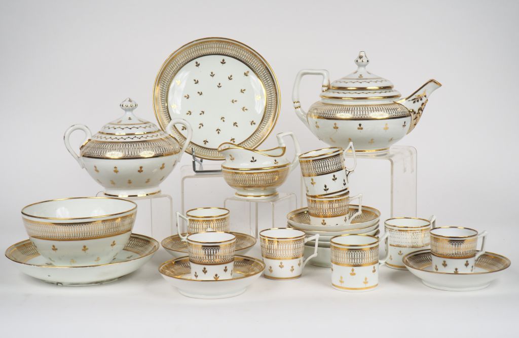 Service à café en porcelaine à décor doré de fleurettes et de motifs géométriques. Comprenant : - 1 cafetière - 1 sucrier - 1 pot à lait - 8 tasses et sous-tasses -1 bol et 2 assiettes à gateaux