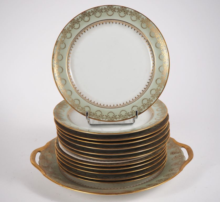 Service à dessert en porcelaine blanche et céladon à décor doré de fleurons et de frise de feuillage comprenant un plateau et douze assiettes.