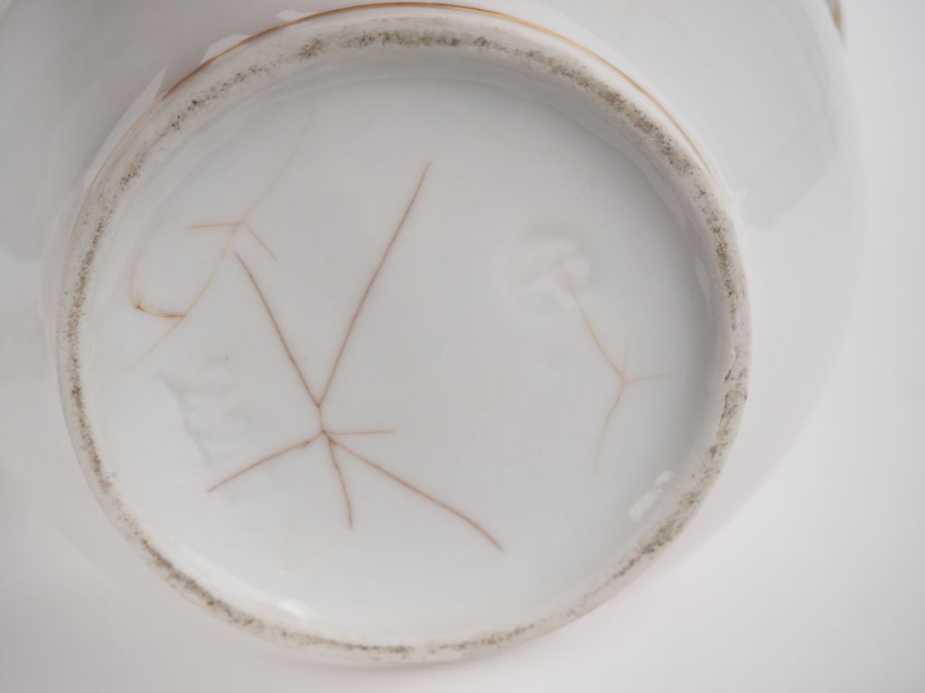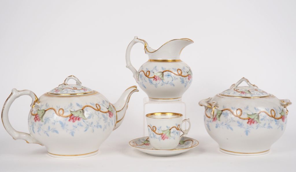 Service à thé Napoléon III en porcelaine à décor de fleurs polychromes et de feuillage comprenant 3 pièces de formes et dix tasses et sous-tasses.