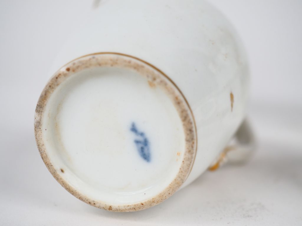 Service de poupée fin XIXème - début Xxème en porcelaine décor polychrome aux barbeaux comprenant une théière, un pot à lait, un sucrier, une paire de tasses et sous-tasses. Marque sous la base.