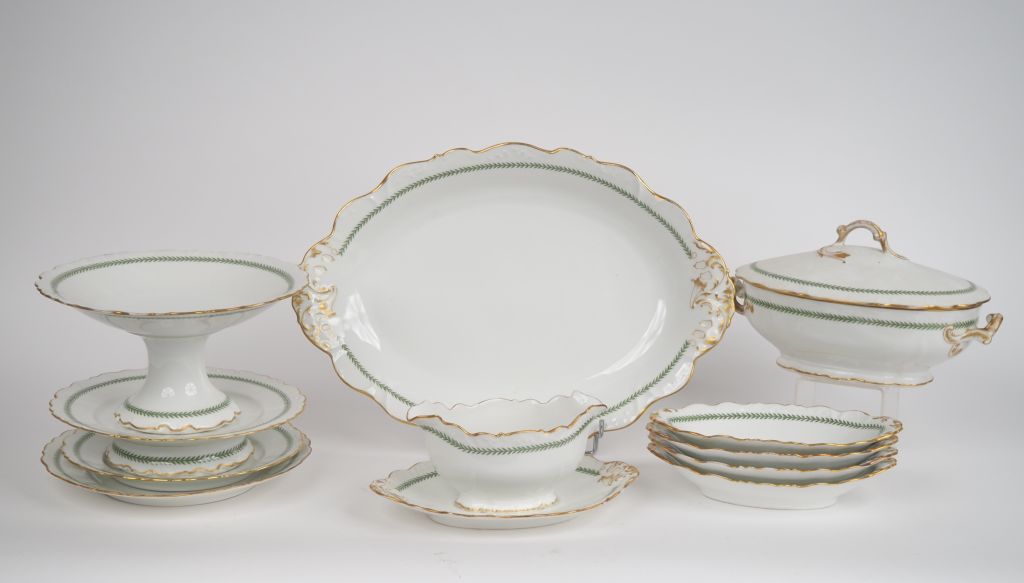 Service de table fin XIXème en porcelaine de Limoges, à décor de guirlandes de feuillage et de liserés dorés comprenant : - 48 assiettes - 22 assiettes creuses - 36 assiettes à dessert - deux compotiers ( fel sur l'un) - quatre raviers - une saucière - un grand plat ovale - un petit plat ovale - deux grands plats ronds - une soupière - cinq coupes sur pied - un légumier et un légumier couvert