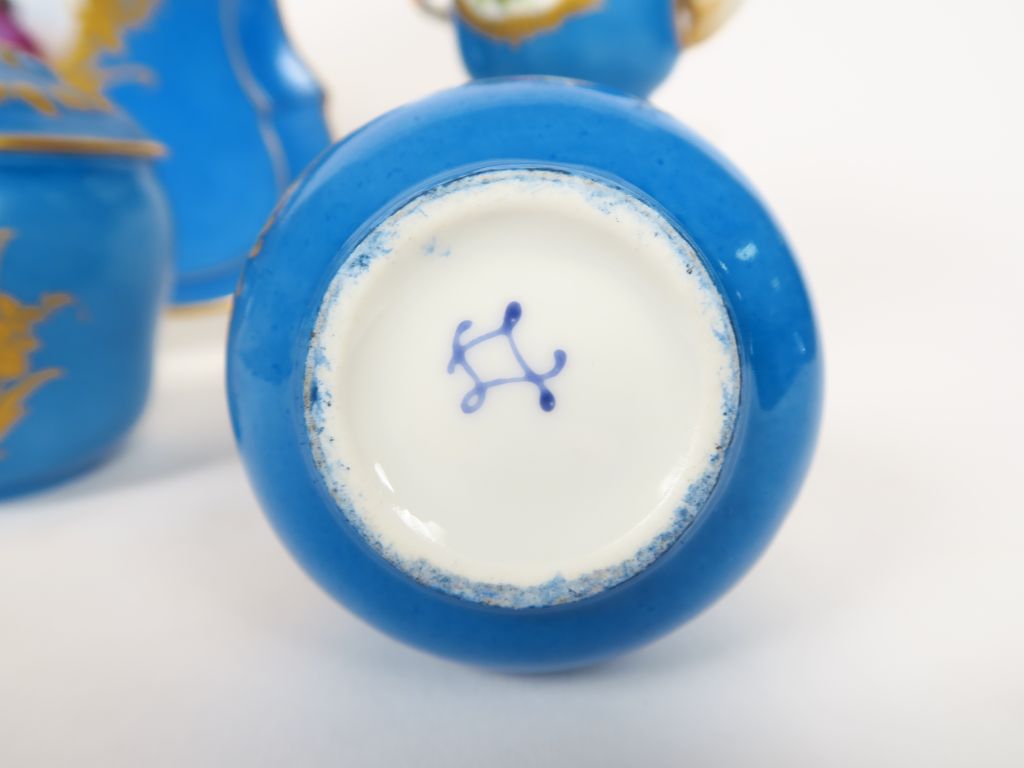 Service tête à tête de style Louis XVI en porcelaine de Sèvres, à décor dans des réserves de portraits de la famille royale sur fond bleu rehaussé d’or. (accidents)