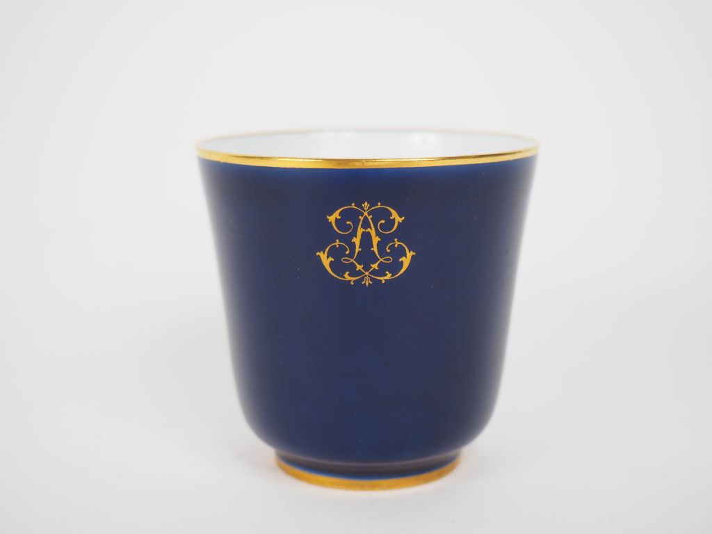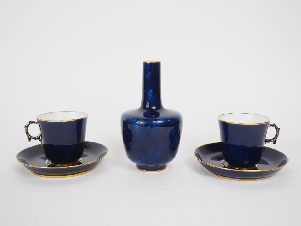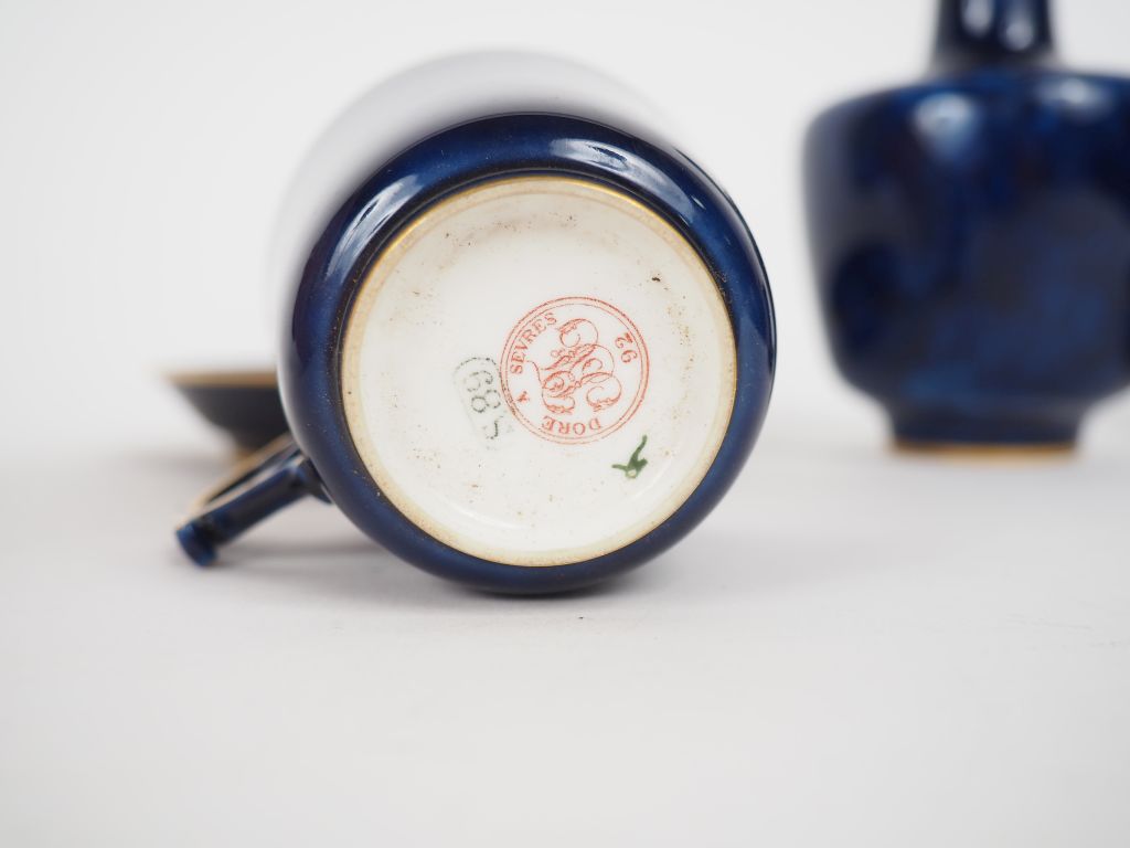 SEVRES. 7 tasses et sous tasses fin XIXème en porcelaine bleu de four et liseré doré Signées et datées on y joint une tasse supplémentaire et un vase soliflore (15 cm) assortis, signés et datés