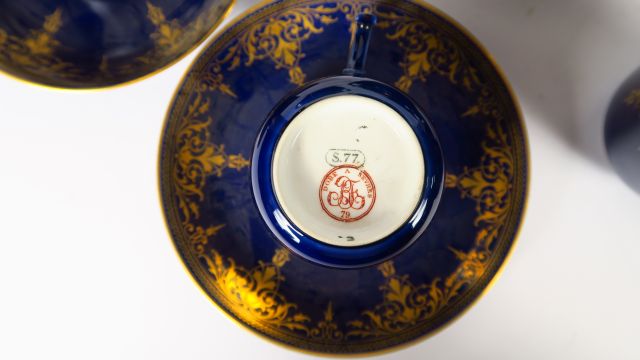 SEVRES. Partie de service à café en porcelaine à décor de liserés dorés et de fleurs sur fond bleu de four comprenant six tasses et sous tasses et trois pièces de forme. Signées et datées 1879.