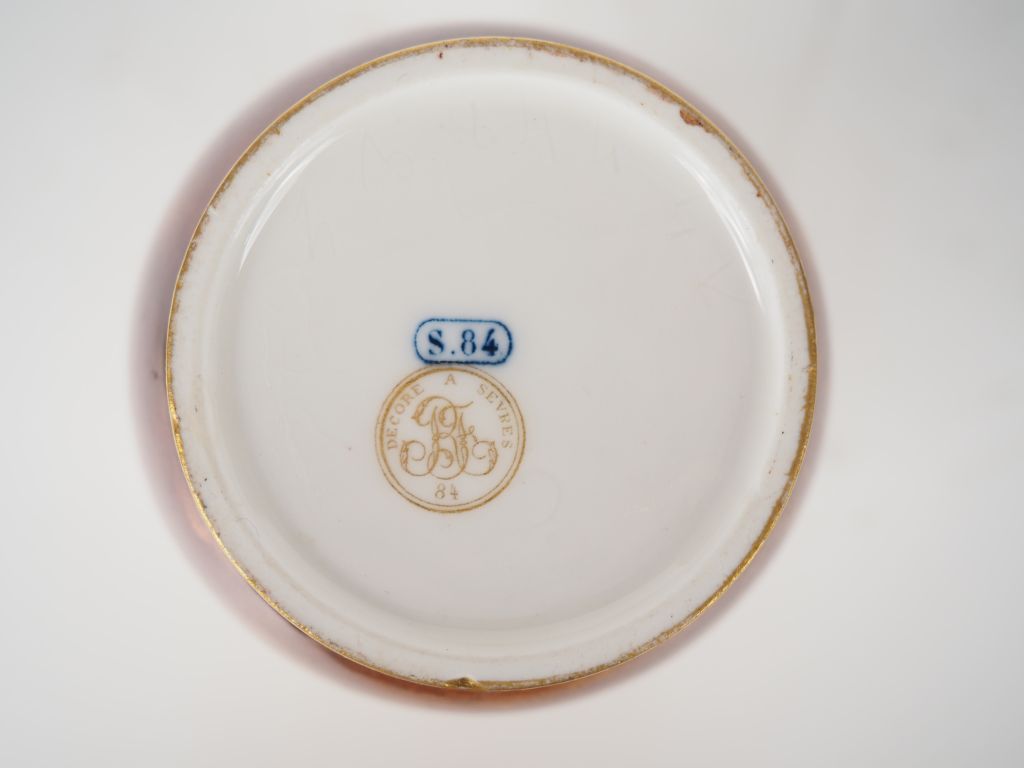 SEVRES. Vase couvert en porcelaine, à décor marbré jaune et brun veiné rouge, signé et daté 1884. H. 24 cm (égrenure sur la base)