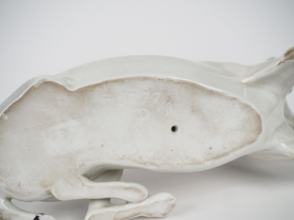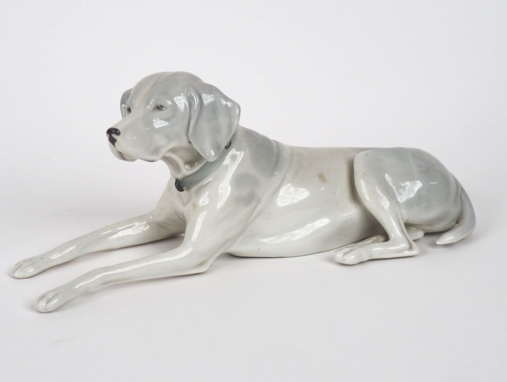 Sujet en porcelaine polychrome de Copenhague "chien de chasse assis". Dim. 9 x 22 cm