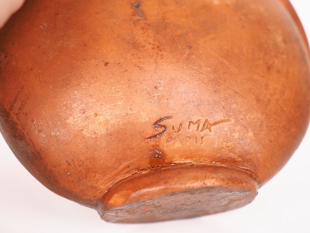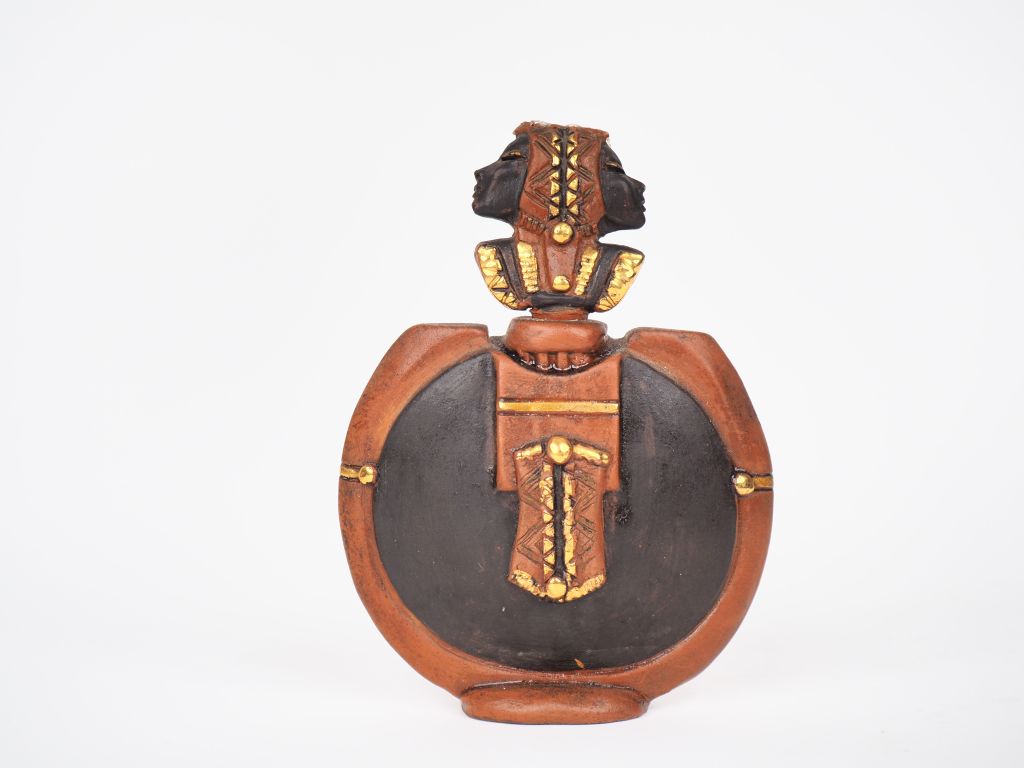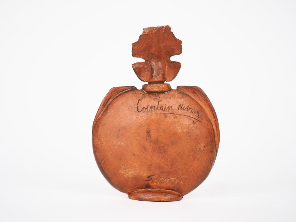 SUMA Paris. "Lointain Rivage" Flacon en terre cuite brune rehaussée d'or à décor de profil de jeune femme. Signée. H. 12,5 cm