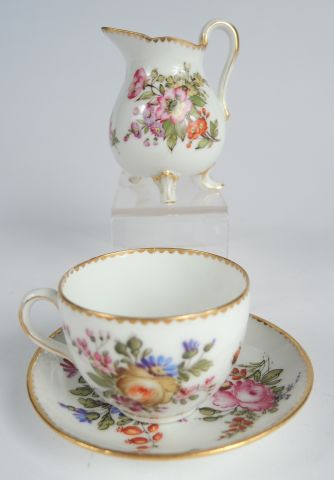 Tasse et sous-tasse début XIXème en porcelaine de Saxe à décor de fleurs polychromes et un pot à lait en porcelaine de Saxe XIXème à décor de fleurs polychromes