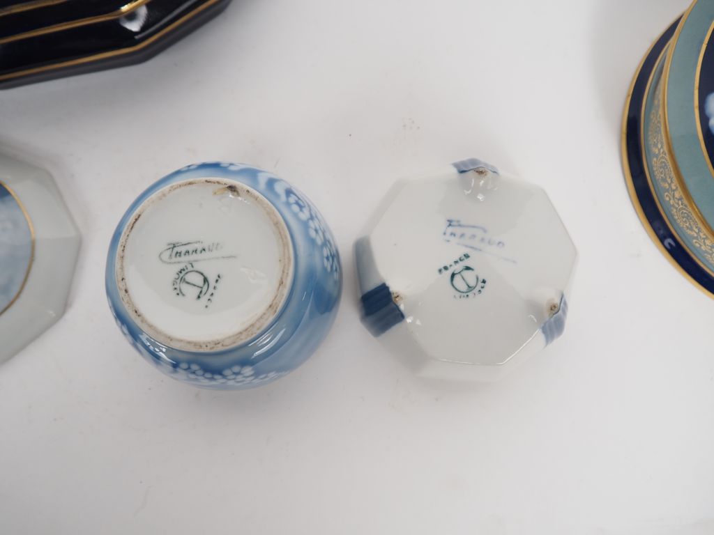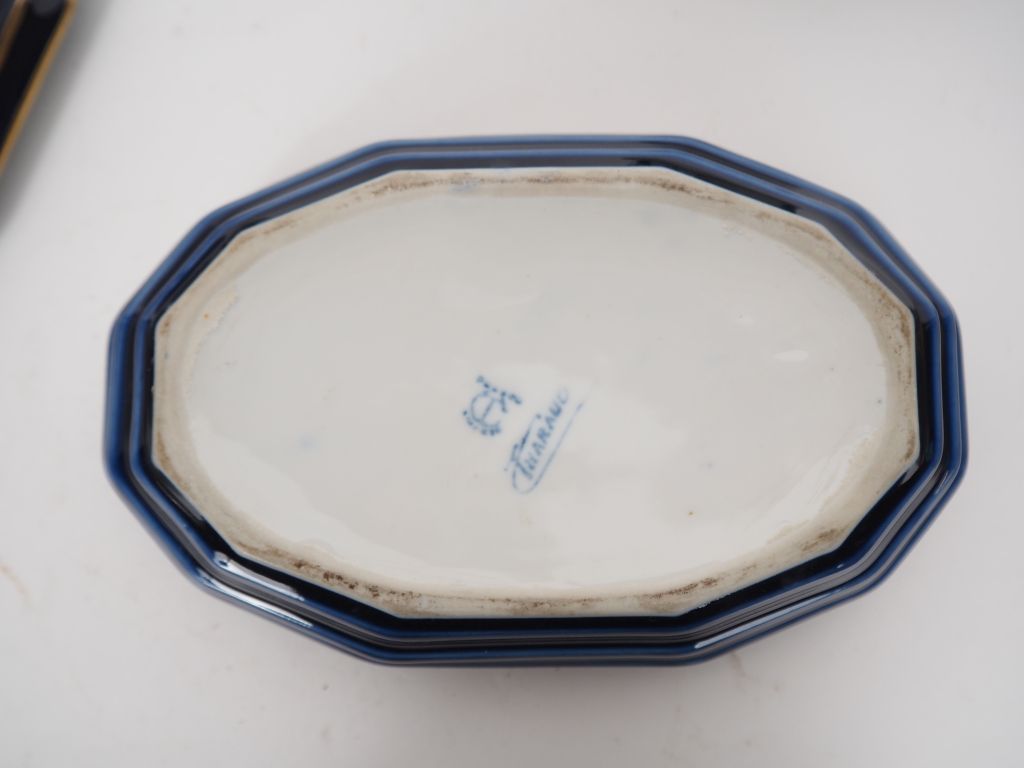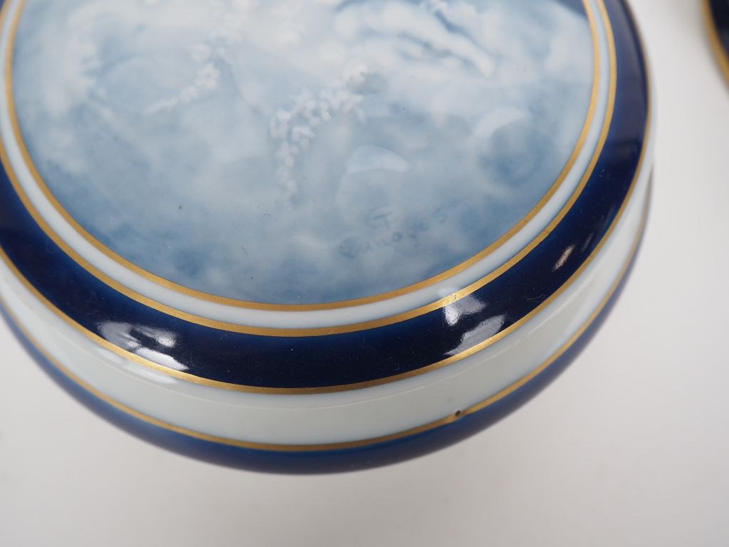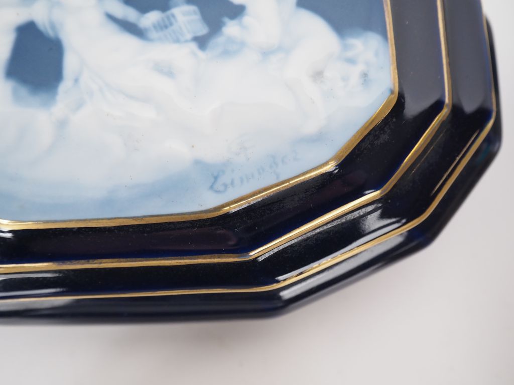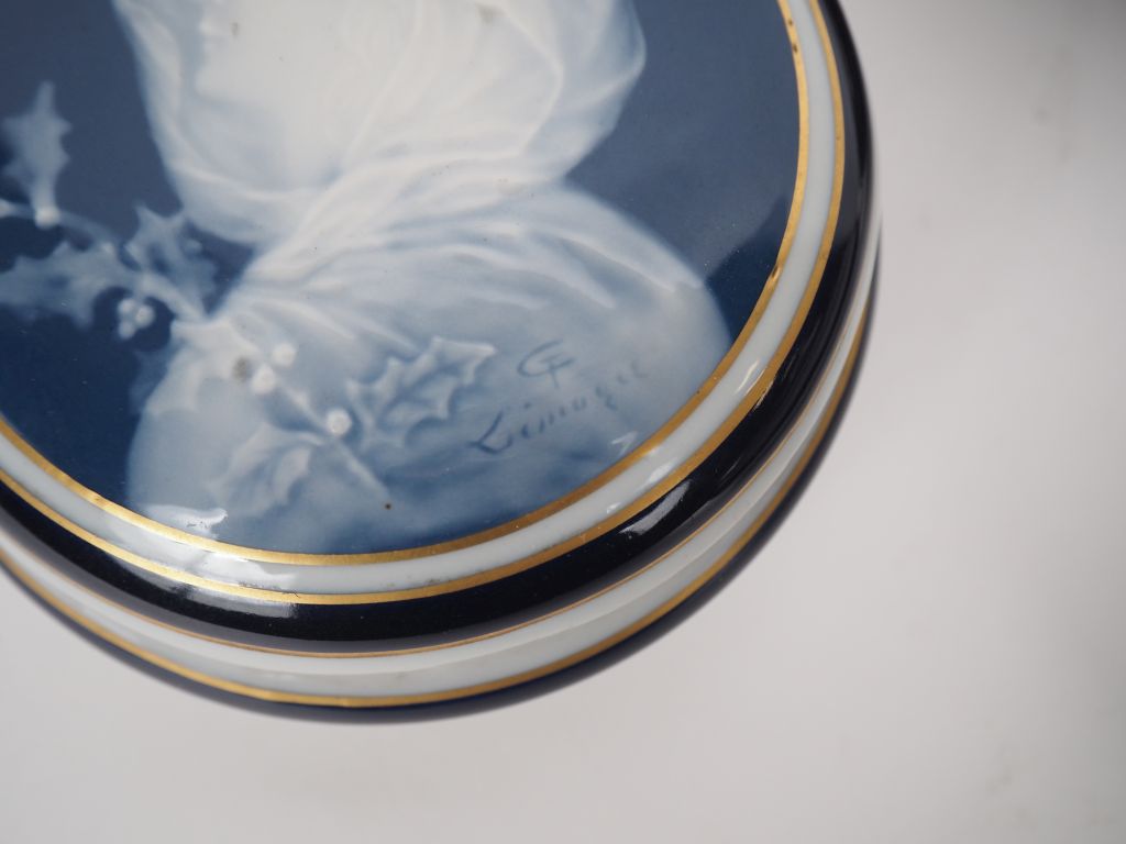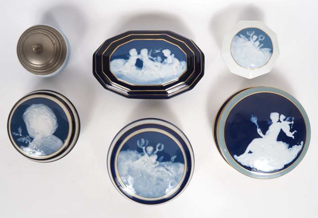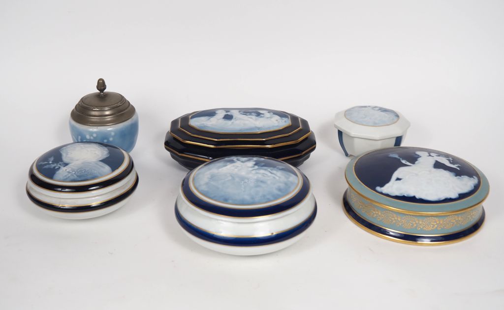 THARAUD. 3 bonbonnières en porcelaine, décor de personnages sur le couvercle. Un sucrier couvercle en étain une boite à pilules On y joint une bonbonnière en porcelaine, F.M Barbotine.