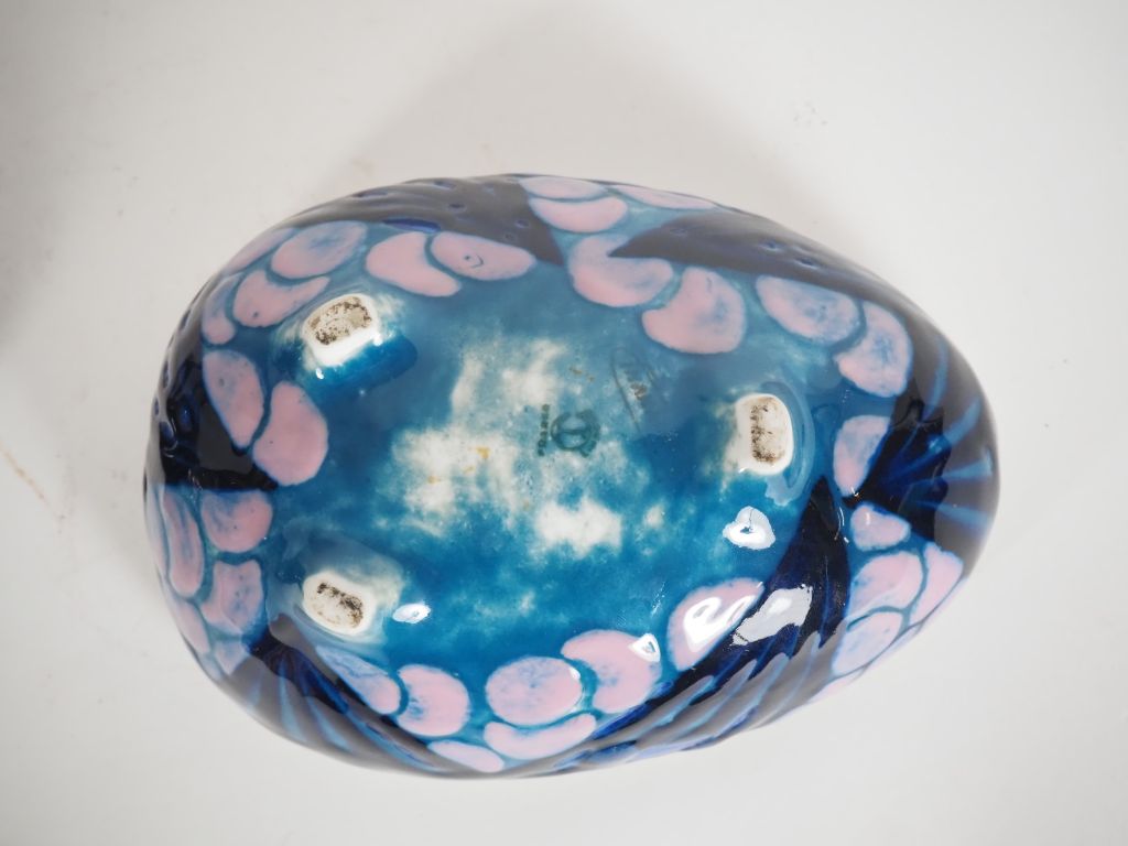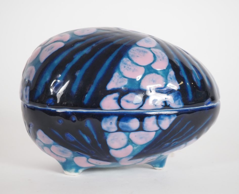 THARAUD. Boite en porcelaine de style Art Déco, en forme d'œuf à décor de motifs stylisés. Dim. 13 x 17 cm