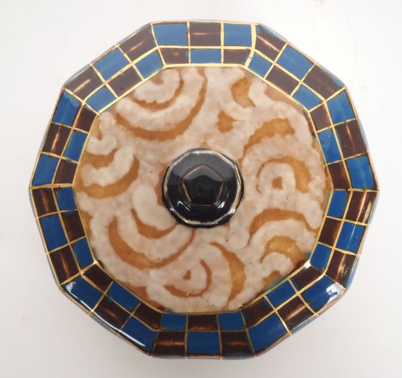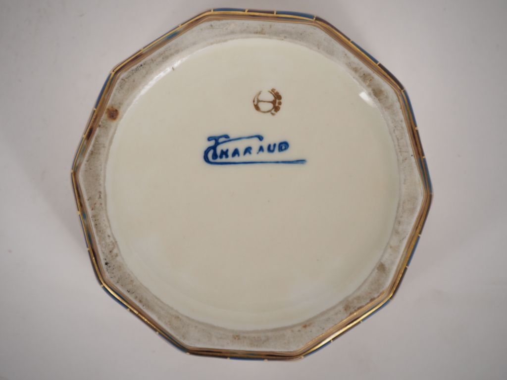 THARAUD. Bonbonnière Art Déco en porcelaine à décor polychrome. Signée Dim. 6 x 12 cm