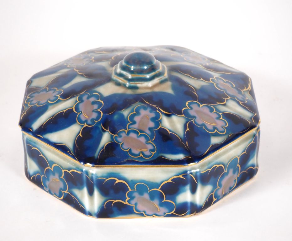 THARAUD. Bonbonnière Art déco en porcelaine de Limoges, à décor de fleurs et de feuillage bleu sur fond clair rehaussé d'or. Dim. 10 x 19 cm