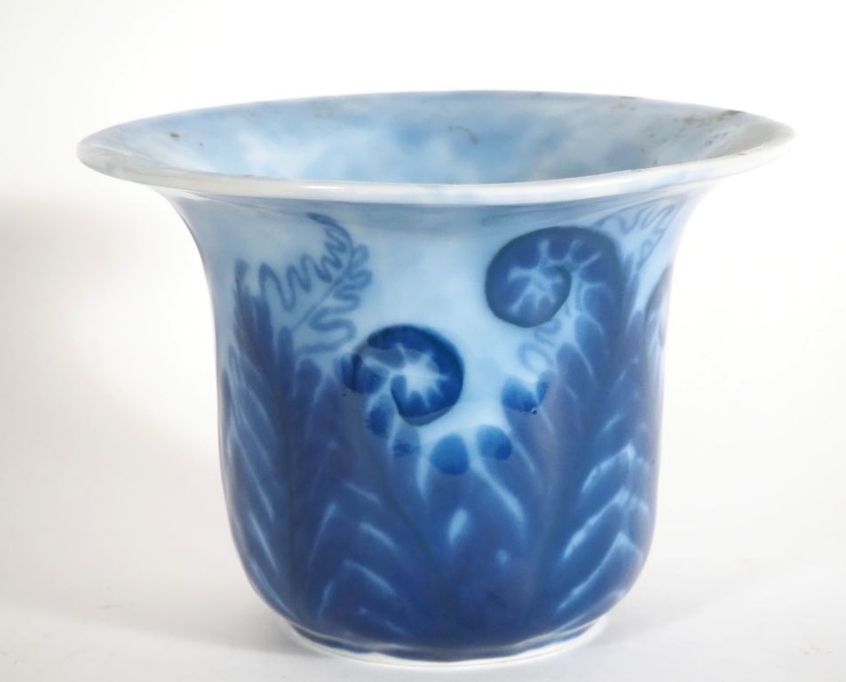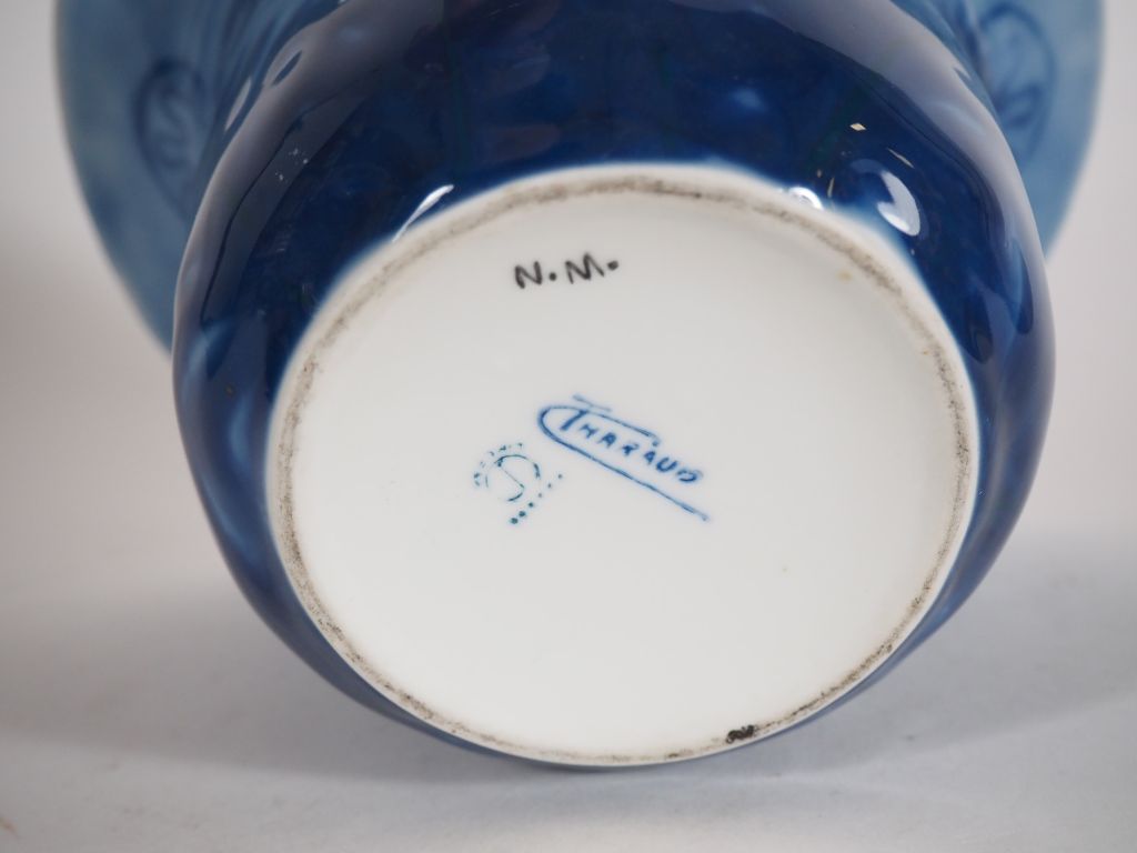 THARAUD. Vase cornet en porcelaine, à décor en camaieu bleu de feuillage. Signé H. 14,5 cm