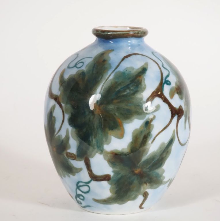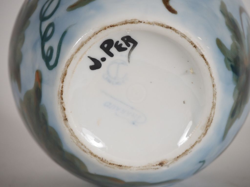 THARAUD. Vase ovoide en porcelaine à décor polychrome de feuilles de vignes Signé H. 18 cm