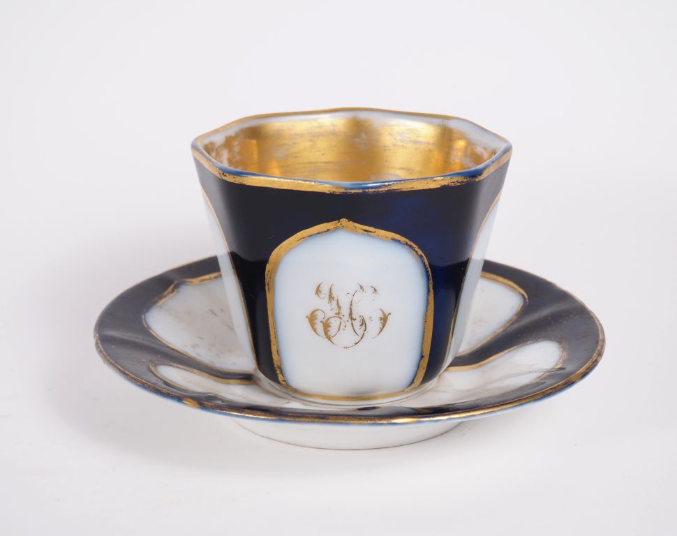 VALENTINE. Déjeuner en porcelaine, blanc et bleu de four rehaussé d'or.
