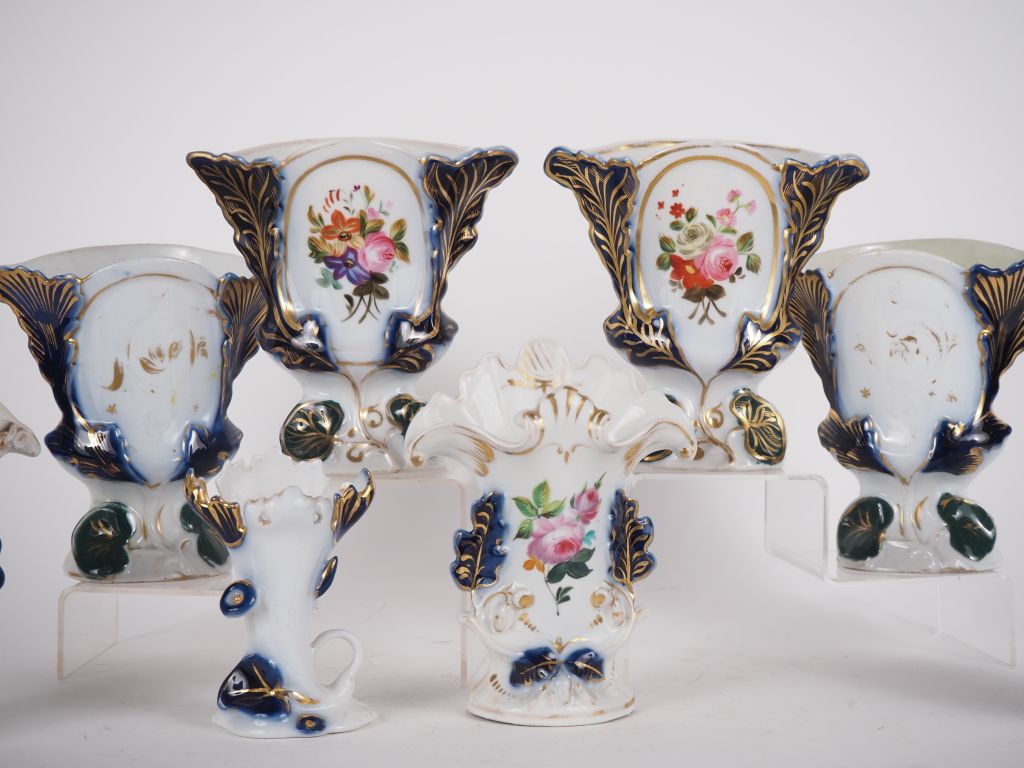 VALENTINE. Ensemble de deux paires et de quatres vases en porcelaine polychrome, on y joint un élément de lampe à pétrôle en porcelaine polychrome à décor de fleurs. (restauration)