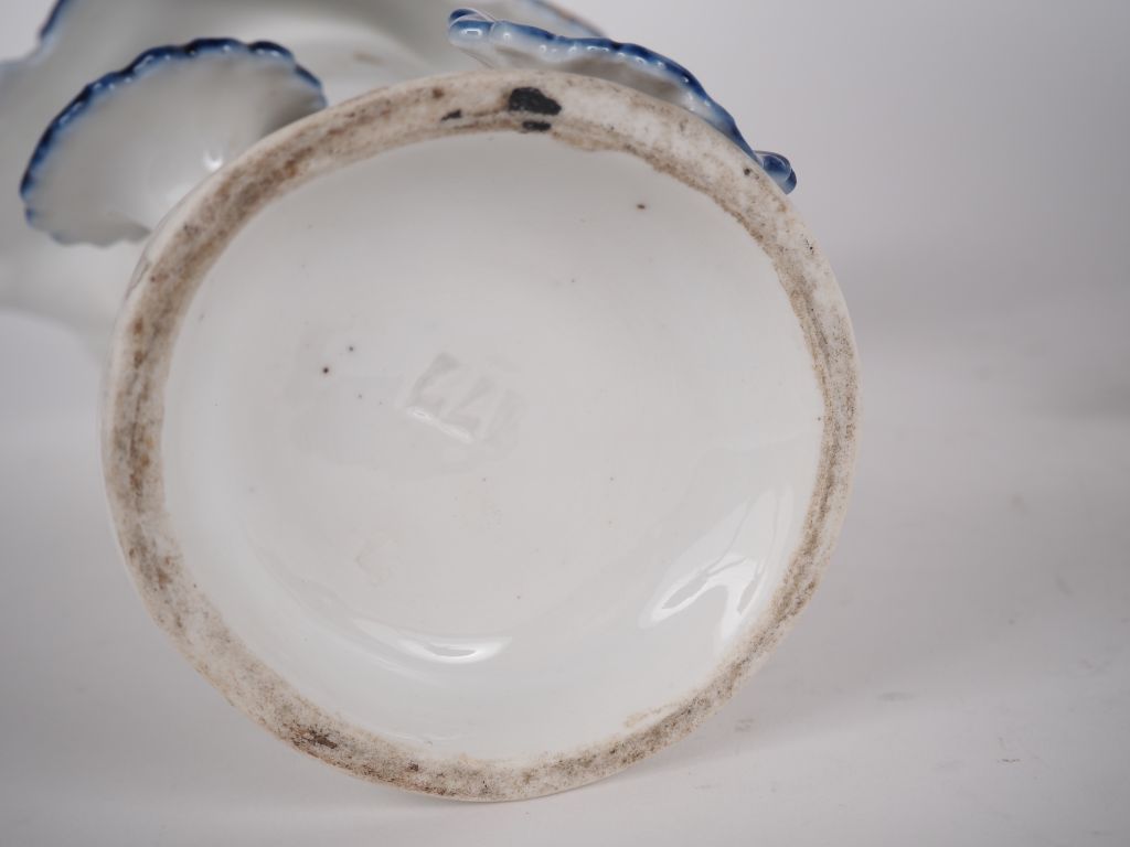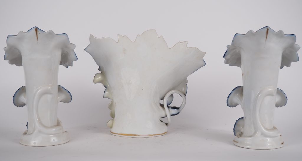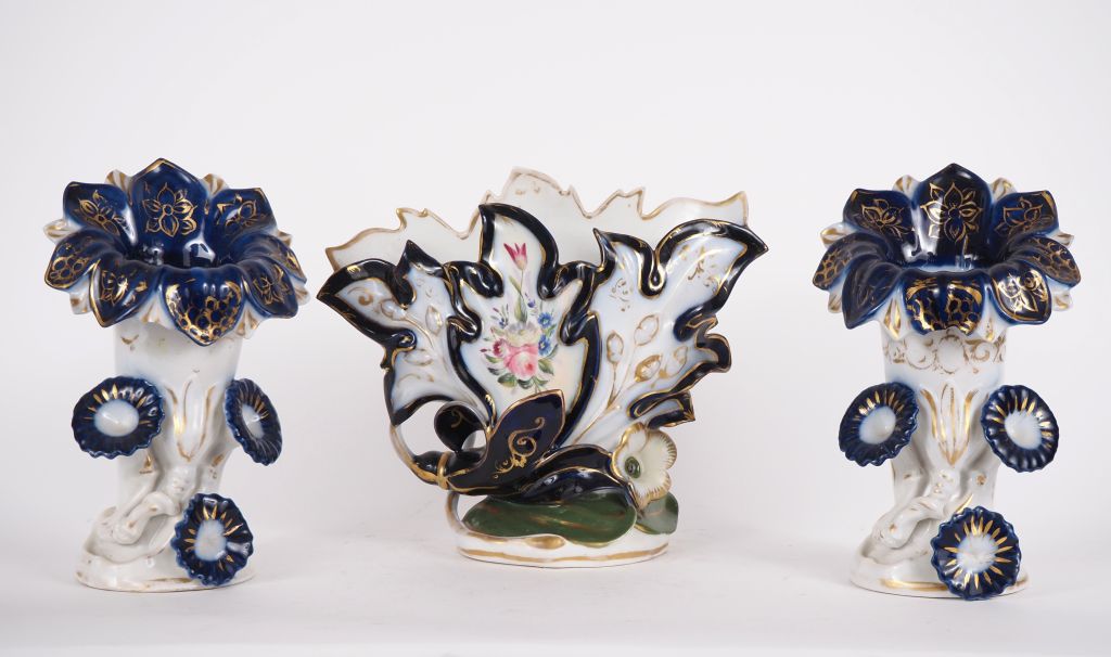 VALENTINE. Grand vase cornet en porcelaine polychrome à décor de fleurs, on y joint une paire de vases cornets en porcelaine sur fond blanc et bleu de four à décor de liserés dorés (petit accident) H. 26,5 cm. (restauration)