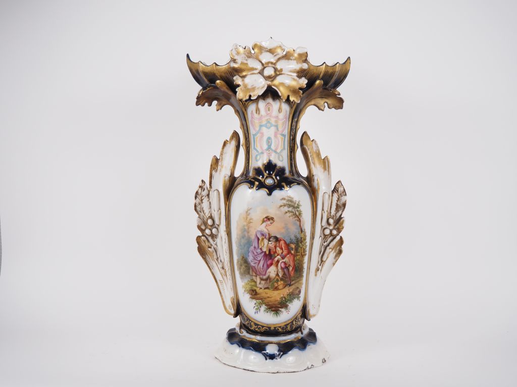 VALENTINE. Grand vase en porcelaine Napoléon III à décor polychrome dans une grande réserve centrale de scène galante. H. 65,5 cm (sauts de dorure, petits chocs, égrenure sur la base)