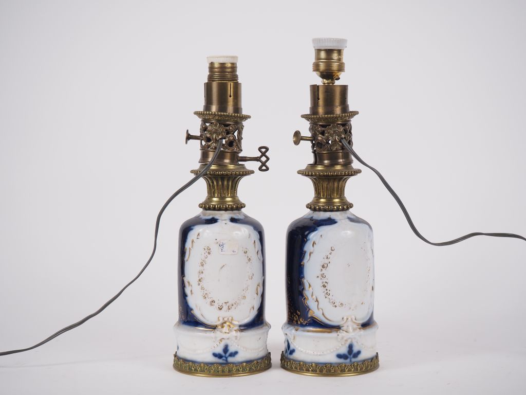 VALENTINE. Paire de lampes à pétrole en porcelaine polychrome à décor dans des réserves de jeune femme en habit du XVIIIème, fond bleu de four. H. 34 cm