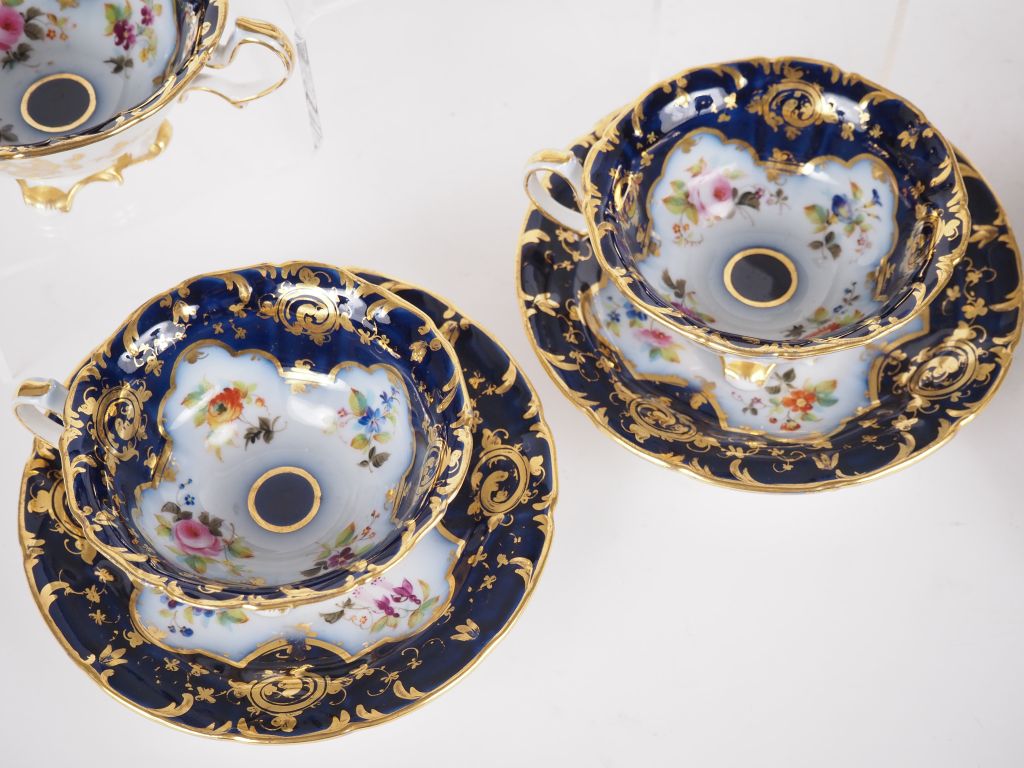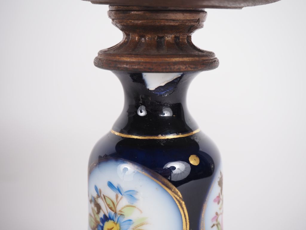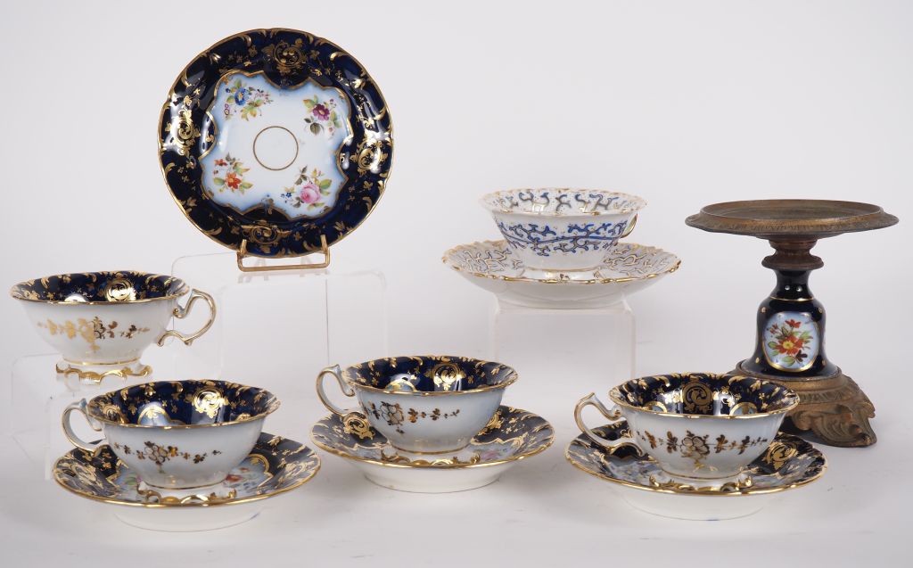 VALENTINE. Suite de 5 tasses et sous tasses, une tasse et sous tasse à décor verniculé et une base de lampe à pétrole (accident), l'ensemble en porcelaine polychrome.