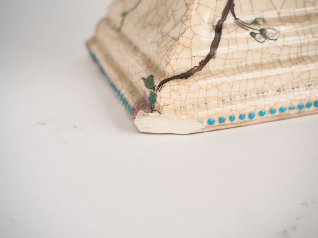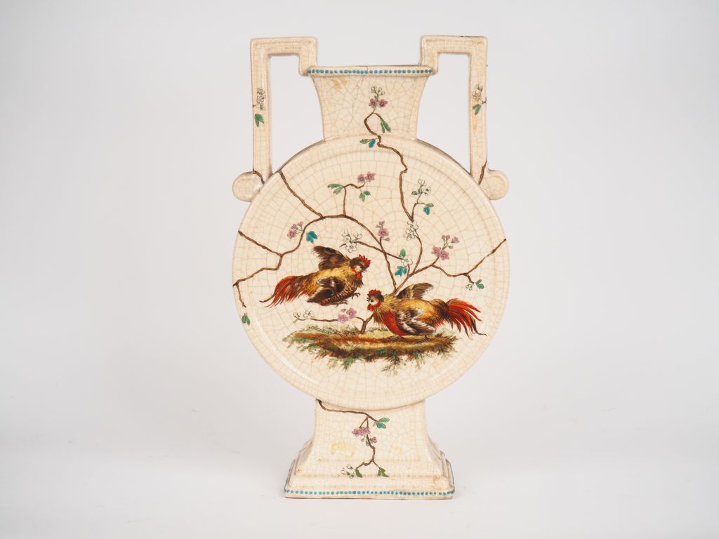 Vase à anses début XXème en céramique craquelée à décor émaillé et polychrome japonisant d'oiseaux et de fleurs. Dim. 48 x 29 cm. (Restauration).