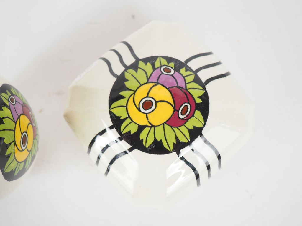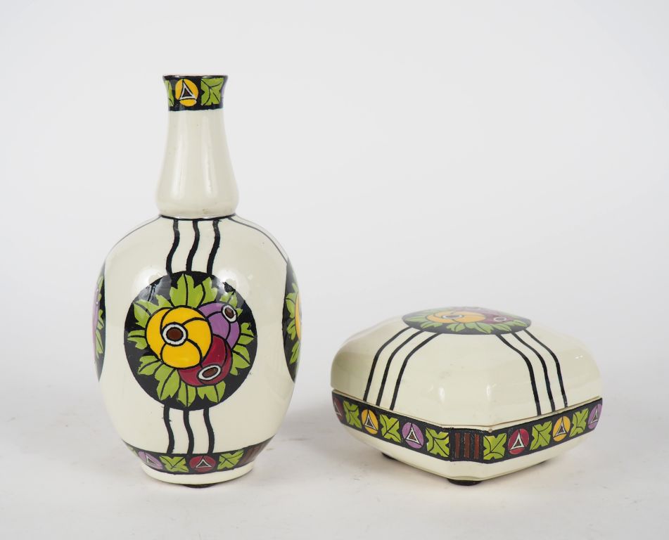 Vase et bonbonnière Art déco en faience fine à décor de fleurs polychromes dans des réserves et de liseré noir sur fond crème. H. vase : 22 cm. Dim. Bonbonnière : 9 x 13 x 13 cm.