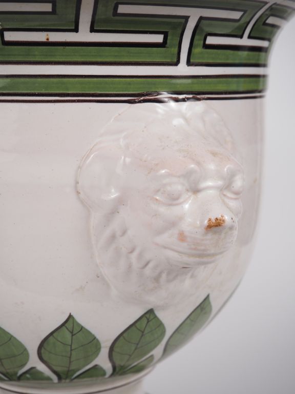 Vase Médicis en faience à décor de grecque, de feuilles et de liserés verts sur fond blanc, anses en forme de mufles de lion. H. 39 cm