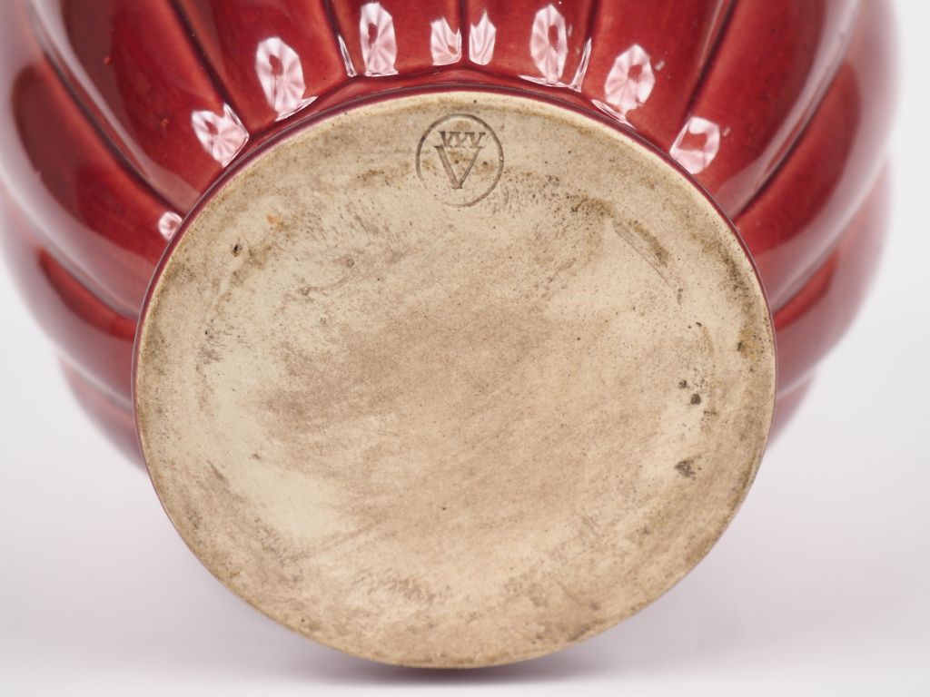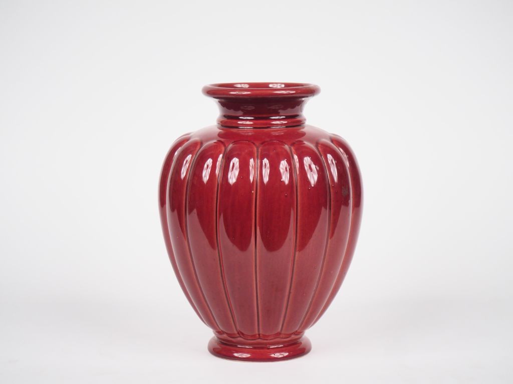 Vase ovoîde en céramique rouge à décor de godrons. Signé sous la base. H. 24 cm.