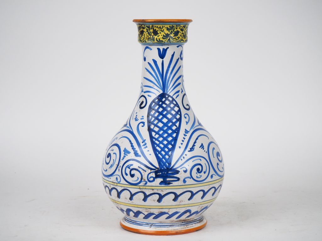 Vase ovoide XIXème en faience italienne, à décor polychrome de personnages et de fleurs. H. 36 cm