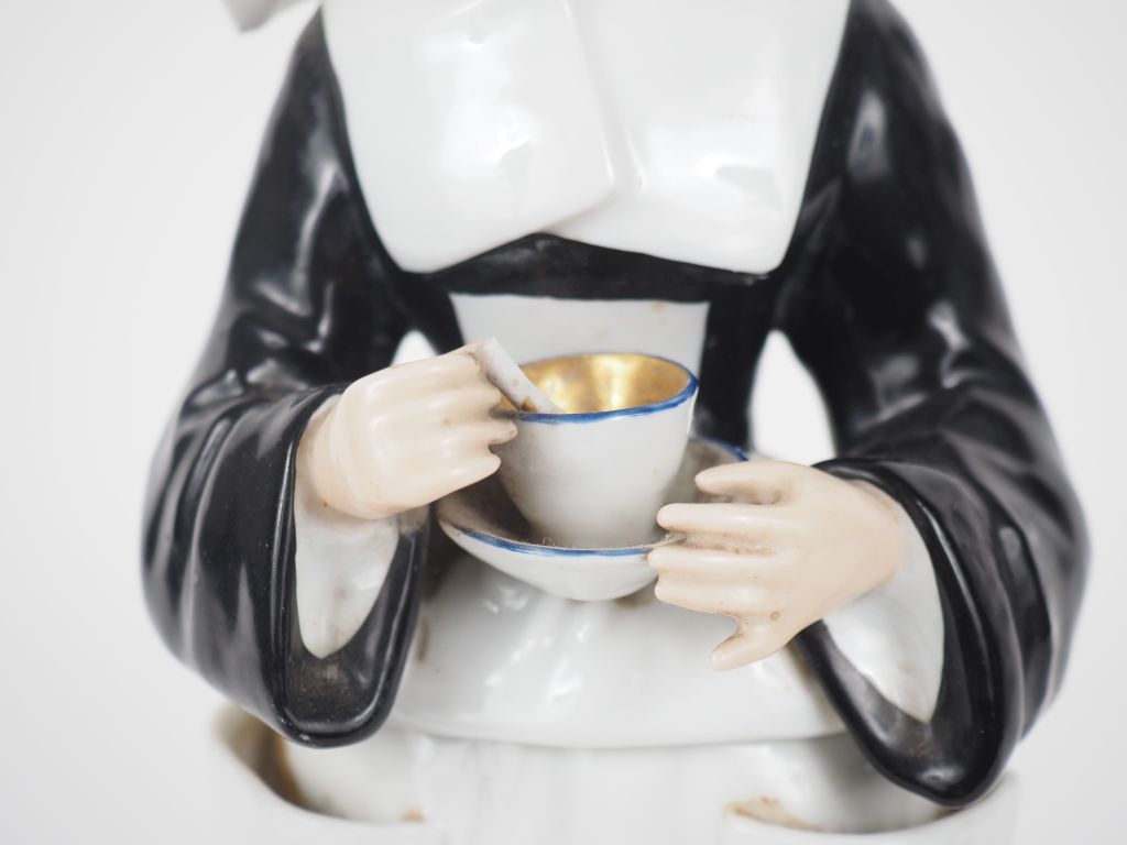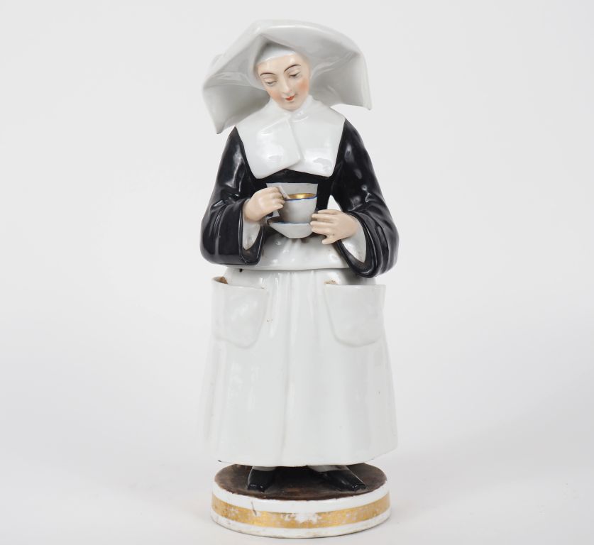 Veilleuse en porcelaine fin XIXème en forme de bonne sœur à la cornette. H. 32 cm (extrémité du manche de la cuillère cassée, fel, manque)