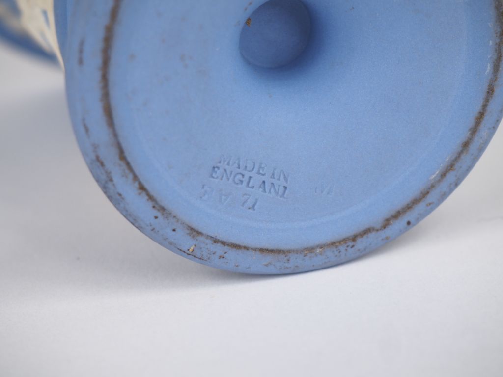 WEDGWOOD. Vase en biscuit à décor de personnages à l'antique sur fond bleu. Signé. H. 14 cm.
