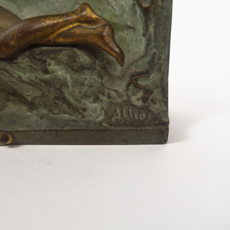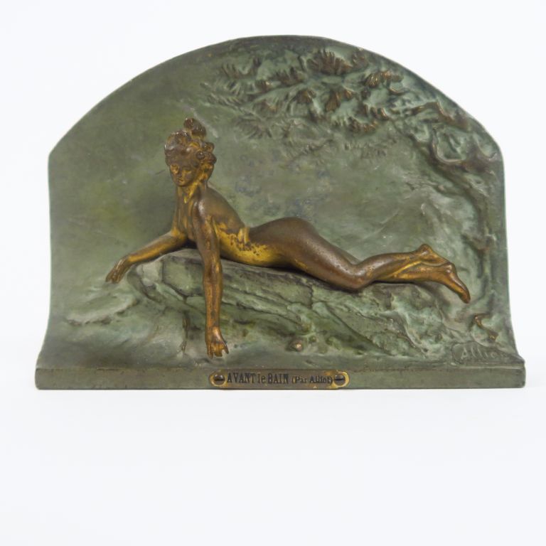 Lot de ALLIOT. "Avant le bain". Plaque en régule 1900 en régule vert et doré. au prix de 50 à 80 € en vente aux enchères par l'hôtel des ventes Primardeco