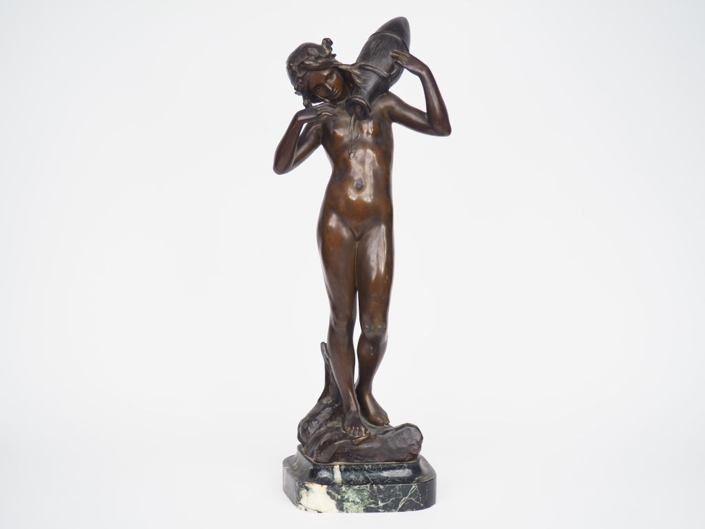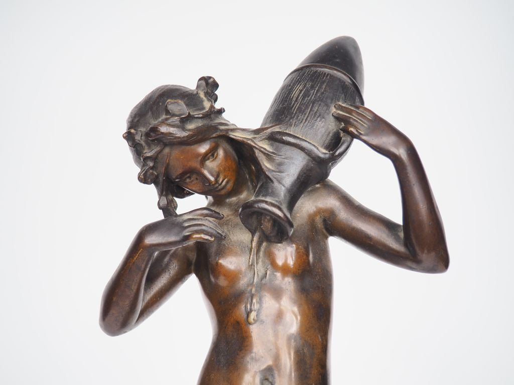 Antoine BOFILL. "Jeune femme à la cruche". Sculpture en bronze à patine brune, socle en marbre vert. Signée. H. (sans le socle) : 51,5 cm. H. (totale) : 57 cm.