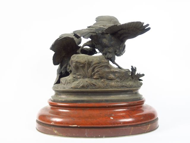 ARSON "Les deux perdrix". Groupe en bronze à patine médaille sur un socle en marbre rouge. Signé, Elégant socle en marbre à doucine. Porte une inscription Beaux Arts 1874 H. sans le socle 33 x 35 cm
