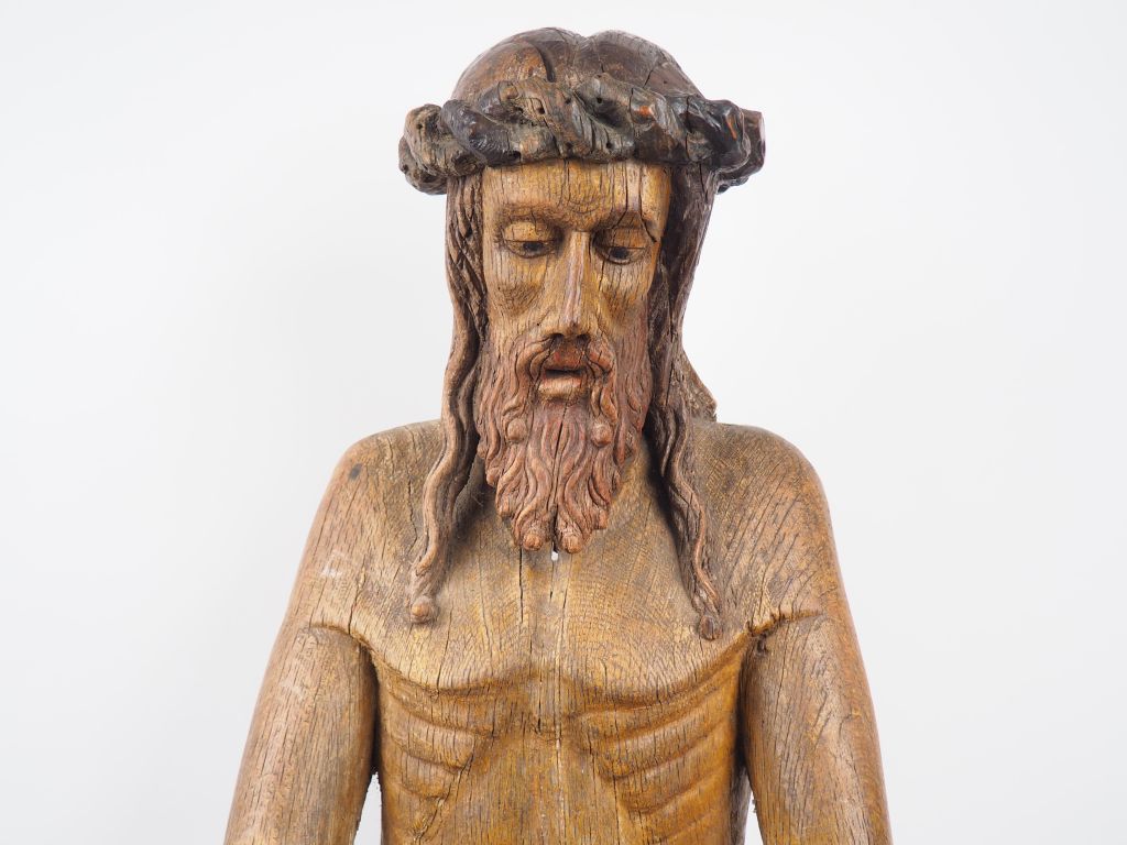 Christ aux liens en chêne sculpté avec traces de polychromie, dos creusé. Tête ceinte d’une épaisse couronne d’épines torsadée, visage allongé avec barbe symétrique tombant en mèches ondulées, anatomie encore archaïque aux pectoraux en pélerine avec plis se prolongeant sur les bras et côtes sous-mammaires en traits parallèles. Est de la France, Lorraine, vers 1500 Hauteur : 110 cm (restauration à la main gauche) Un Christ aux liens en pierre sculptée visible à a cathédrale de Metz présente une anatomie du buste très comparable. Expert : Laurence Fligny