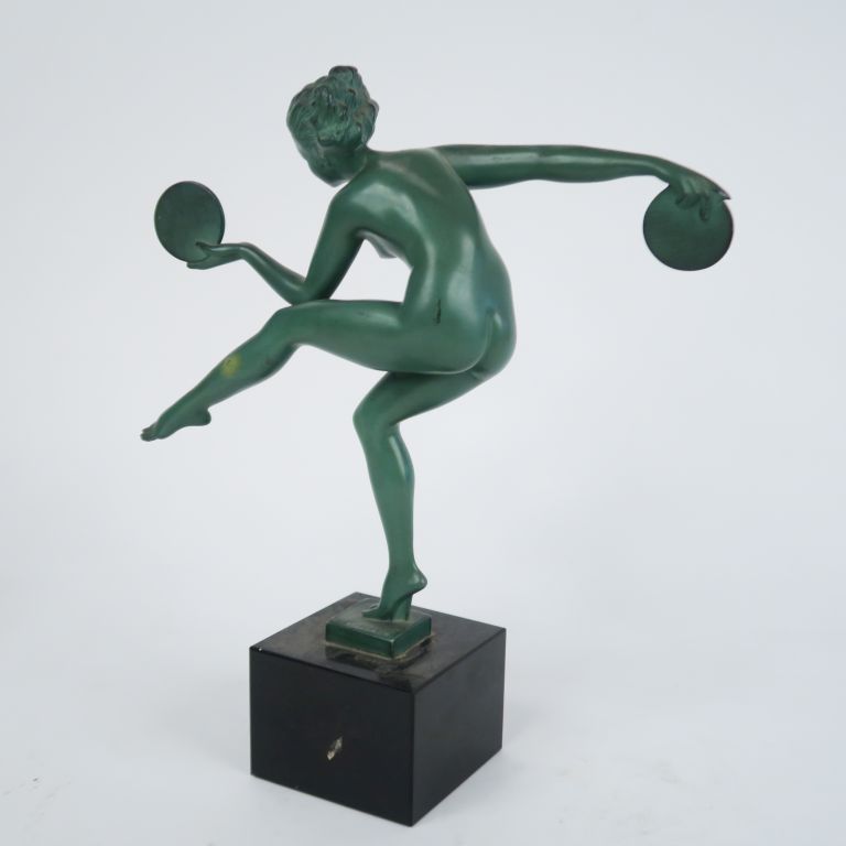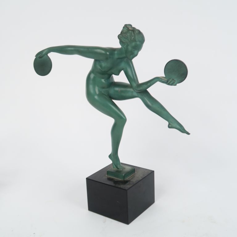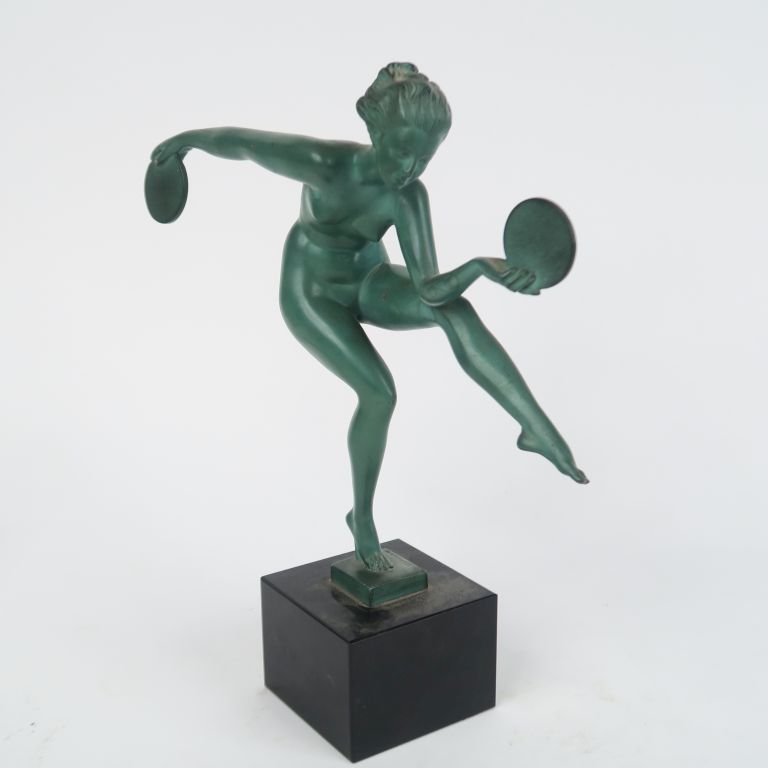 DERENNE. "danseuse au disque" Sujet Art déco en régule à patine verte, socle en marbre noir H. totale : 26,5 cm