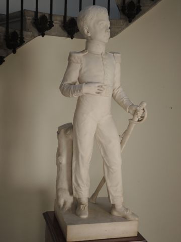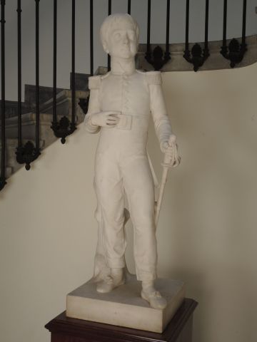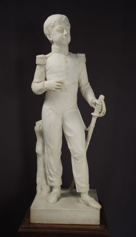 Dominik MAHLKNECHT (1793-1876) 'Portrait du duc de Bordeaux, comte de Chambord enfant'. Exceptionnelle sculpture en marbre blanc. H. 127 cm (petit accident). Socle en acajou à section carrée (manque sur l'attache de l'épée, fente et soulèvement au placage). H. 90 cm