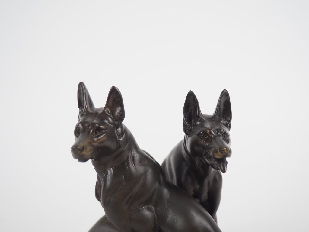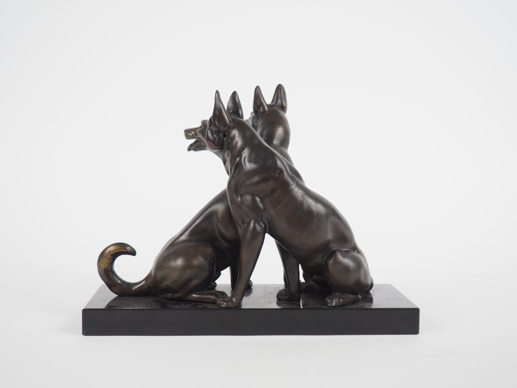 Ecole française Art Déco. Groupe en régule et marbre noir "les deux chiens loups" Dim. 19 x 25 cm (petite égrenure au marbre sur un des côtés)