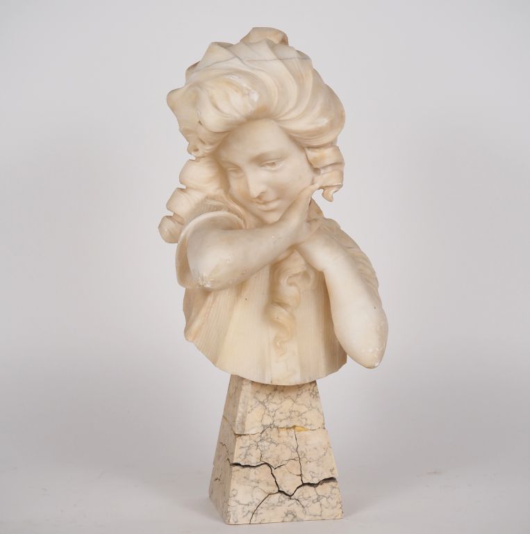 Ecole française début XXème. "Jeune fille timide". Sculpture en albâtre. Signée. H. 31 cm. (accidents)