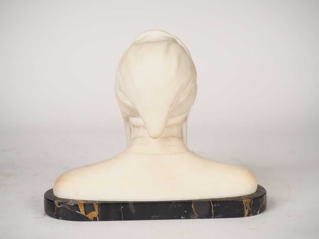 Ecole française début XXème. "Portrait de Dante" Sujet en albâtre sur un socle en marbre portor. Dim. 19 x 24 x 10 cm.