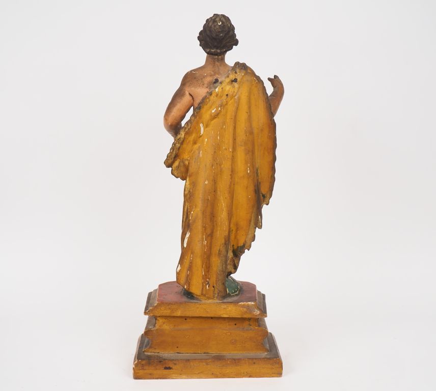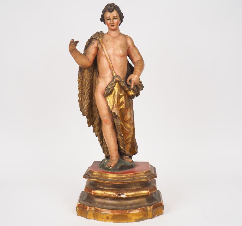 Ecole française fin XVIIIème - début XIXème. "Saint Jean-Baptiste" Sculpture en bois polychrome et doré, les yeux en sulfure. H : 71 cm (accidents).