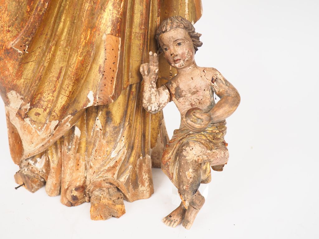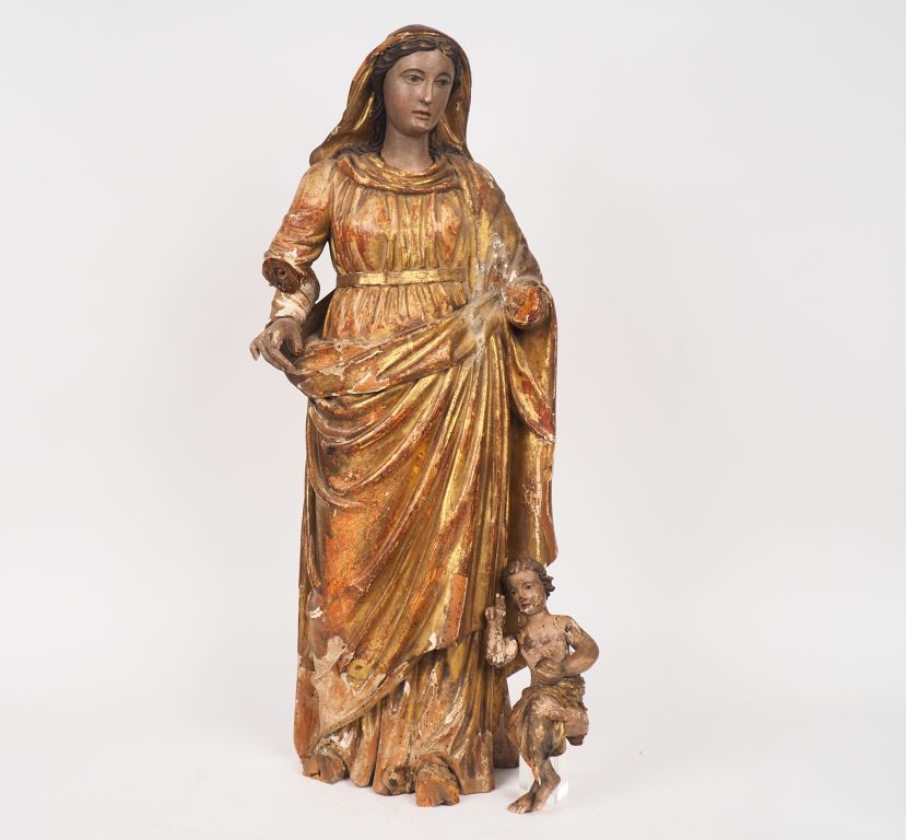 Ecole française XVIIIe. "Vierge à l'enfant". Sculpture en bois polychrome et dorée. H. 81 cm. (accidents). Dim : 83 cm