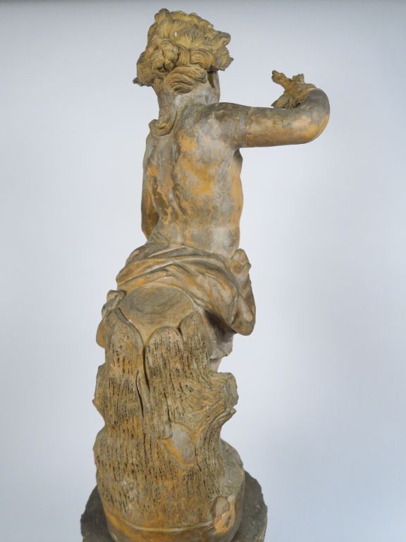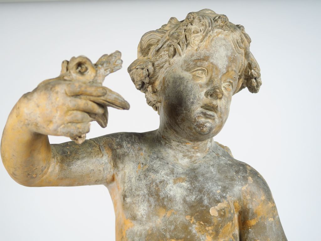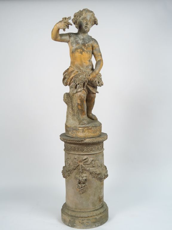 Enfant personnifiant l’Eté en terre cuite ronde-bosse avec restes de monochromie couleur pierre. Debout contre un tronc placé derrière lui, la tête ceinte d’une couronne de fleurs, il tient des fleurs dans sa main droite levée et des épis de blé de l’autre. Socle en forme de colonne ornée d’une guirlande de fleurs tenue par un ruban avec frise de fleurons à la partie supérieure. Première moitié du XVIIIème siècle. H. 100 cm H. totale : 187 cm (quelques accidents et fissures) Expert : Laurence Fligny