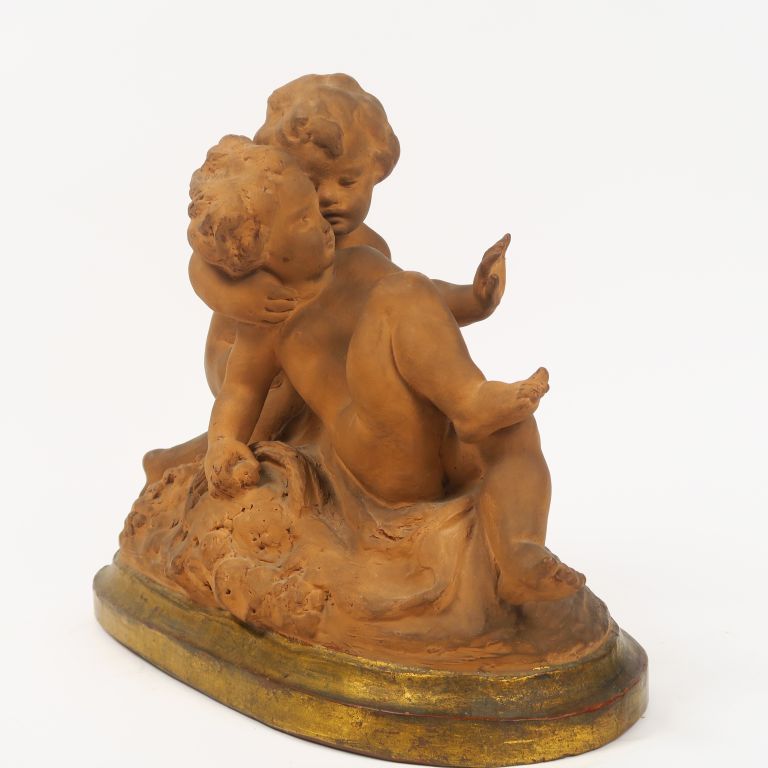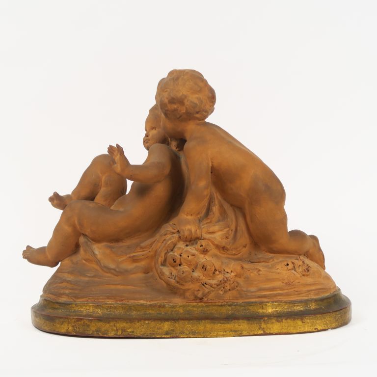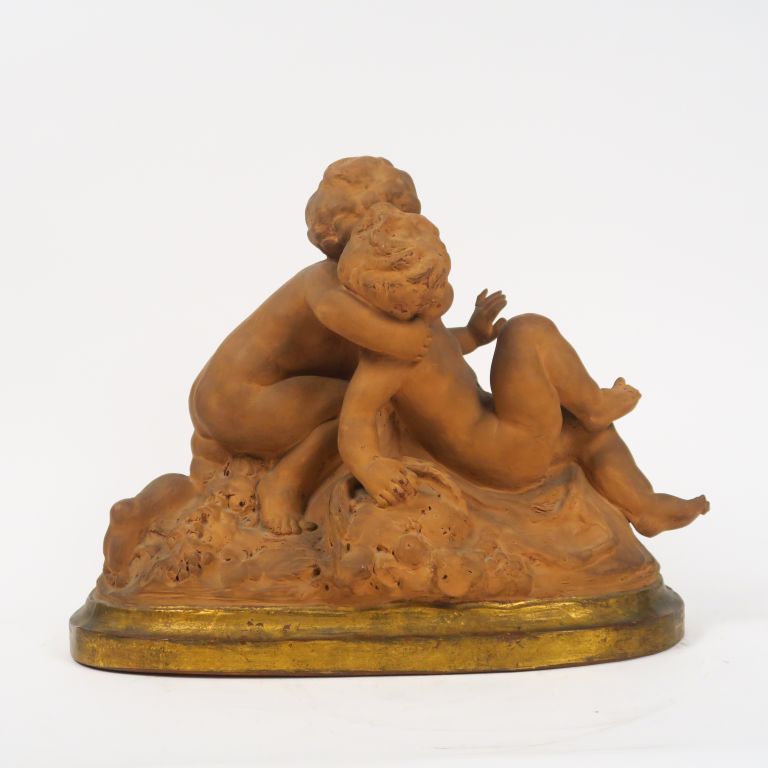 GENARELLI "Puttis jouant" Groupe XIXème en terre cuite. Signé. 35 x 46 x 19 cm (petit accident à un doigt)