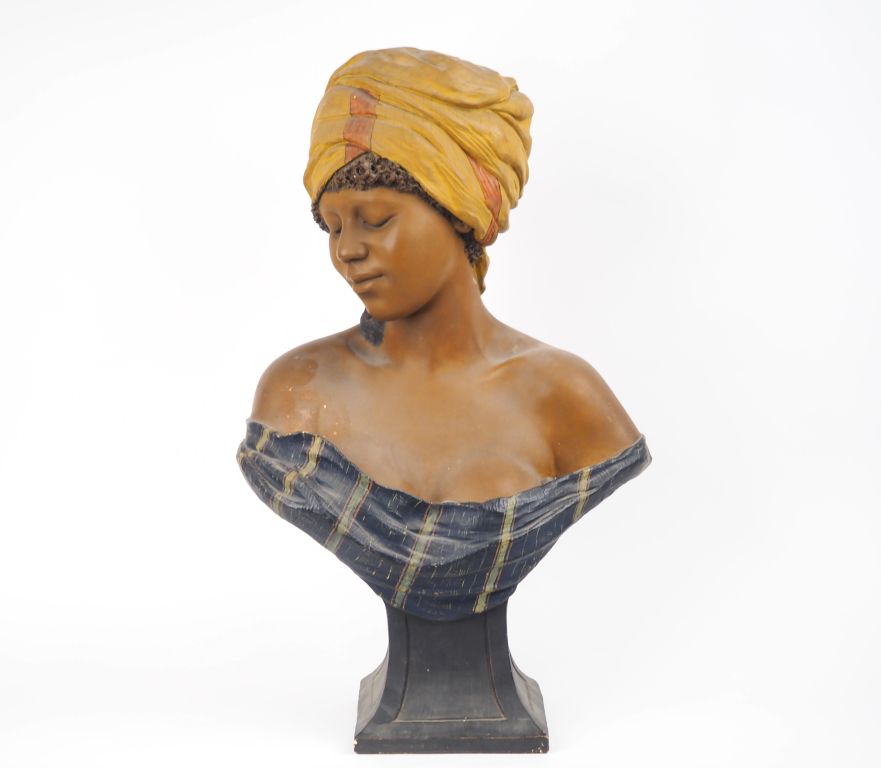 GOLDSCHEIDER. "buste d'orientale au turban" en stuc polychrome. Signée et située à Wien H. 72 cm (petite manque)